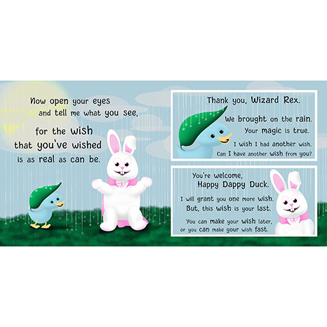 Fourth – Dappy Duck is enchanted by Wizard Rex the White Rabbit. Wizard Rex grants Dappy two wishes.