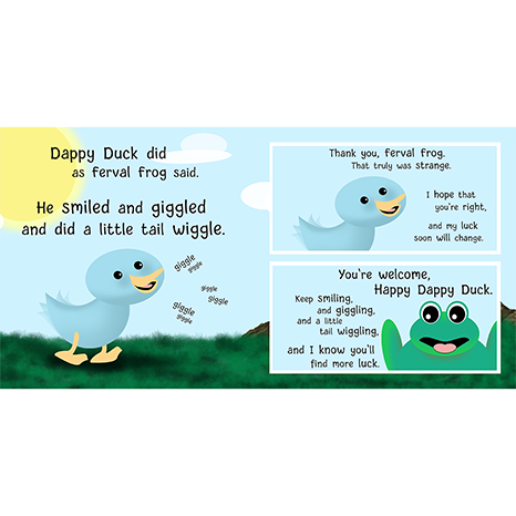 First – Dappy Duck encounters Ferval the Friendliest Frog. Ferval teaches Dappy a dance to bring him more luck.