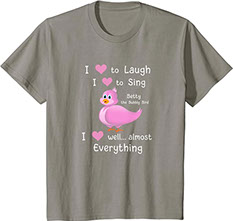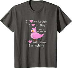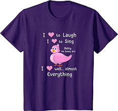 Choose from assorted colors that reflect your love for Betty the Bubbly Bird. Not only can you buy one for that joyful child or children in your life, but you can also purchase one for yourself. Available in Children and Adult sizes.