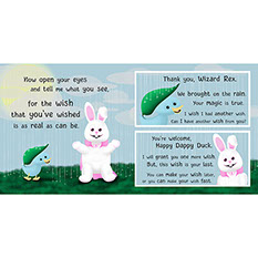 Fourth – Dappy Duck is enchanted by Wizard Rex the White Rabbit. Wizard Rex grants Dappy two wishes.